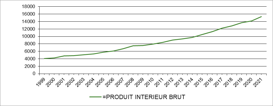 Le graphique montre globalement une évolution exponentielle du PIB, donc de la croissance économique, sur la période 1999-2021.