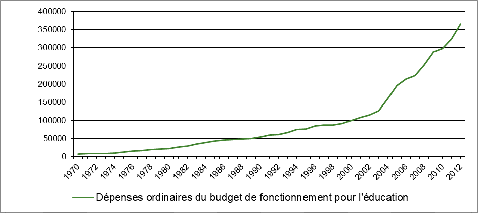 Il pourrait être plus intéressent, si les données étaient disponibles, de pousser l’analyse de la contribution de l’éducation dans l’économie du Sénégal en étudiant le rapport entre les dépenses d’éducation qui augmentent (voir le graphique ci-après) et la productivité nationale ou encore la relation qui existe entre les dépenses publiques éducatives et la réduction du chômage. Mais puisque, selon les économistes, la productivité et la réduction du chômage se soldent par une création des richesses soutenue, donc d’une croissance économique en hausse, l’étude effectuée sur le rapport entre la scolarisation et la croissance économique permet de saisir la manière dont l’éducation a contribué dans l’économie du Sénégal sur la période 1999-2018. De plus, cela n’est que le rendement privé de l’éducation et il est théoriquement prouvé que le rendement social de l’éducation est plus élevé que celui privé.