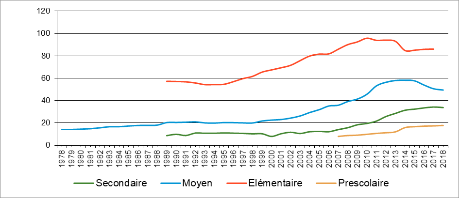 Selon l’institut national de statistiques et des études économiques (INSEE), le taux de scolarisation est le rapport entre le nombre d’élèves, d’étudiants et d’apprentis en formation initiale d’un âge déterminé inscrits dans un établissement d’enseignement et le nombre de jeunes de cet âge. C’est un indicateur clé pour mesurer le niveau d’accès à l’éducation pour une population donnée. Au Sénégal, une observation de l’évolution du taux de scolarisation montre que celui-ci a connu des améliorations. Le graphique suivant, construit à partir des données de l’ANSD, qui illustre l’évolution des taux bruts de scolarisation aux niveaux préscolaire, élémentaire, moyen et secondaire de 1978 à 2018 permet de le constater.